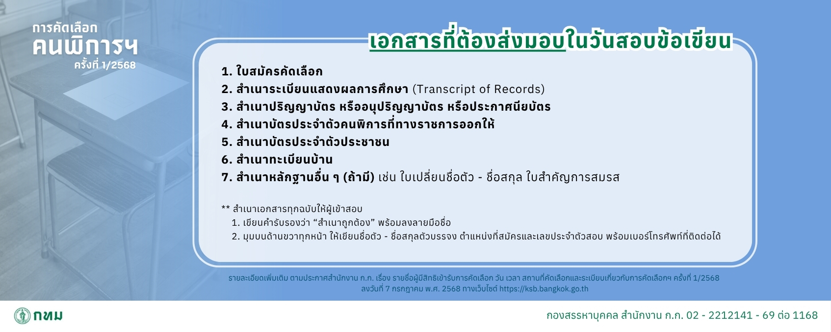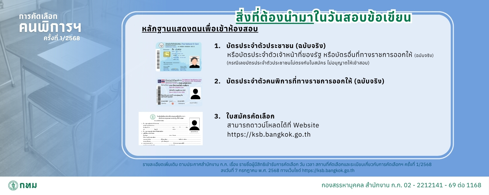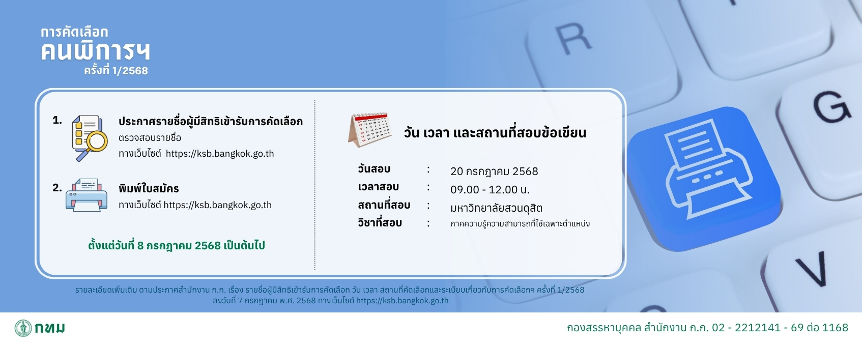 ประกาศสำนักงานคณะกรรมการข้าราชการกรุงเทพมหานคร เรื่อง รับสมัครคัดเลือกคนพิการเพื่อบรรจุและแต่งตั้งเข้ารับราชการเป็นข้าราชการกรุงเทพมหานครสามัญ ครั้งที่ 1/2568
