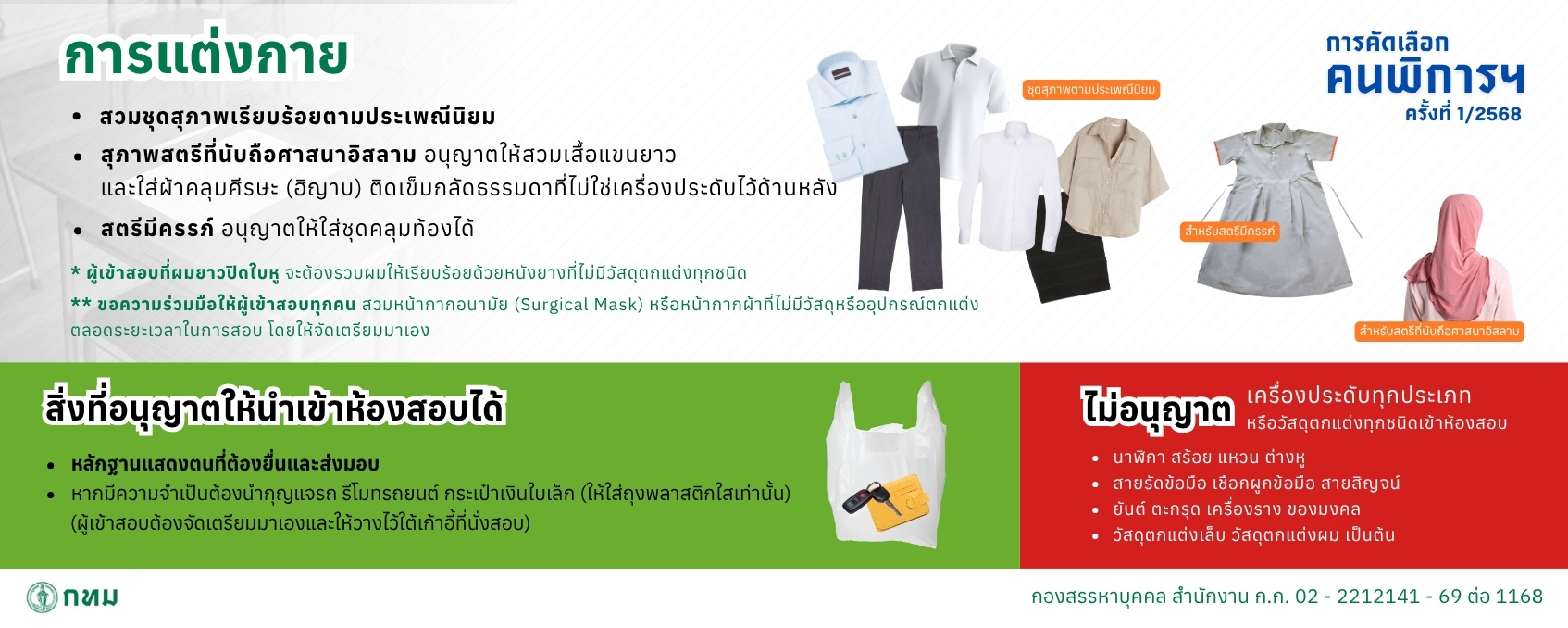 ****กรณีถนัดมือซ้าย หรือ มีน้ำหนักตัวเกิน 100 กิโลกรัม ซึ่งต้องการความช่วยเหลือเพิ่มเติม ให้ติดต่อกลุ่มงานสรรหาบุคคล 2 กองสรรหาบุคคล โทร 0 2225 6894 หรือ 0 2221 2141 - 69 ต่อ 1168 ภายในวันที่ 5 มิถุนายน 2568 ก่อนเวลา 16.00 น.